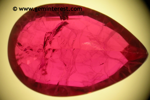 *Rubis synthétique obtenu par fusion (Verneuil), traité thermiquement pour être craquelé et ensuite traité thermiquement en présence de fondant pour "cicatriser" les fractures.