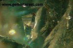 Euclase (900) Euclase Bleu foncé, Zimbabwé: Inclusion de type: 'probablement liquide', de nature: 'probablement givres de guérisons', à aspect: 'givres déchirés (ressemblant aux trichites des tourmalines)'. Transmis et Incident ~45X